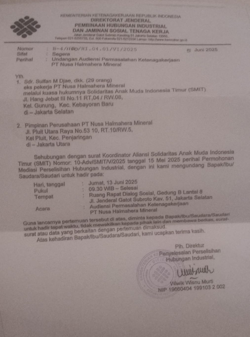 Untuk diketahui, sebelumnya Kemnaker RI melayangkan surat undangan Audiensi kepada pihak manajemen PT. NHM, surat dikirimkan pada tanggal 5 Juni 2025.(red)